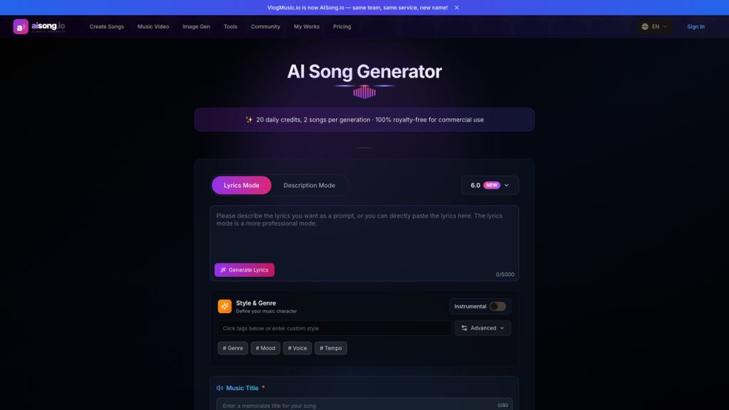 AIsong is another powerful music creation platform that focuses on simplicity and speed. Designed as a modern AI Song Maker, the platform enables users to generate songs without needing any music production experience. It’s ideal for beginners, influencers, and small creators who want unique music for their content.